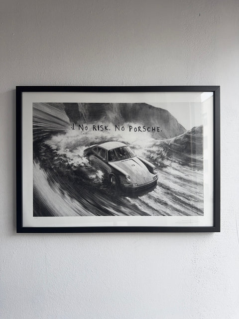 “No Risk. No Porsche.” is a painting about the risk we take in pursuit of our dreams. My dream is a Porsche 911. And the turn toward it is captured in the drift of a Porsche DLS — a symbol of courage, of the moment when you speed up to face the unknown.